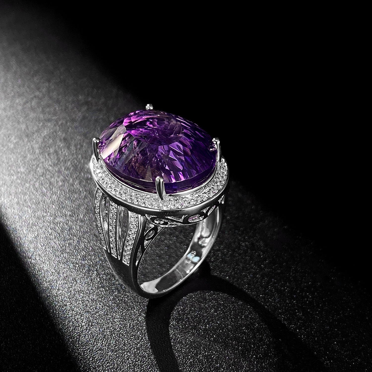 Elevate your spirit and style with this handcrafted 925 sterling silver ring featuring a breathtaking natural amethyst (23.5 × 18.2 mm, 20 ct) surrounded by sparkling cubic zirconia crystals. Every facet captures light and energy, creating a piece that radiates balance, intuition, and timeless elegance.